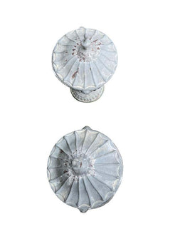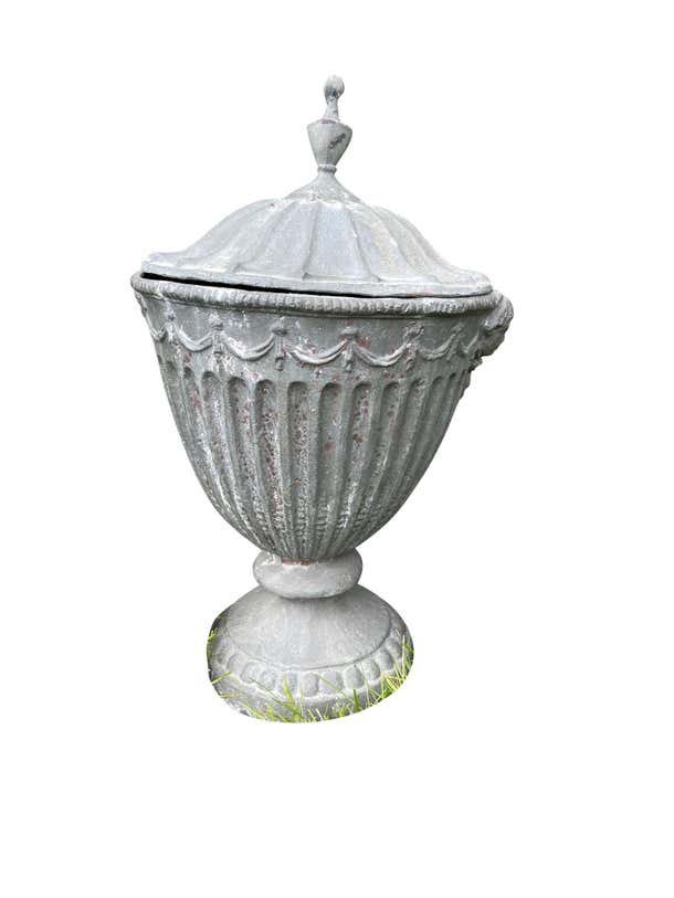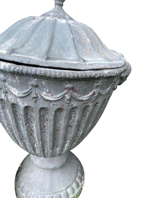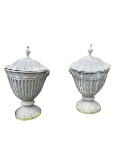 A pair of large antique 19th century English Regency period lead garden urns & covers. Each with fluted vase form...