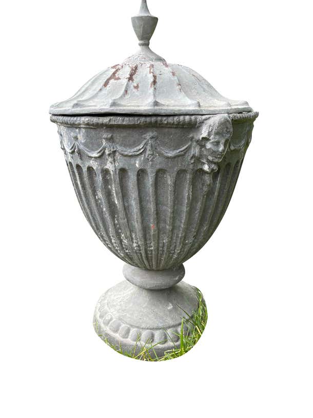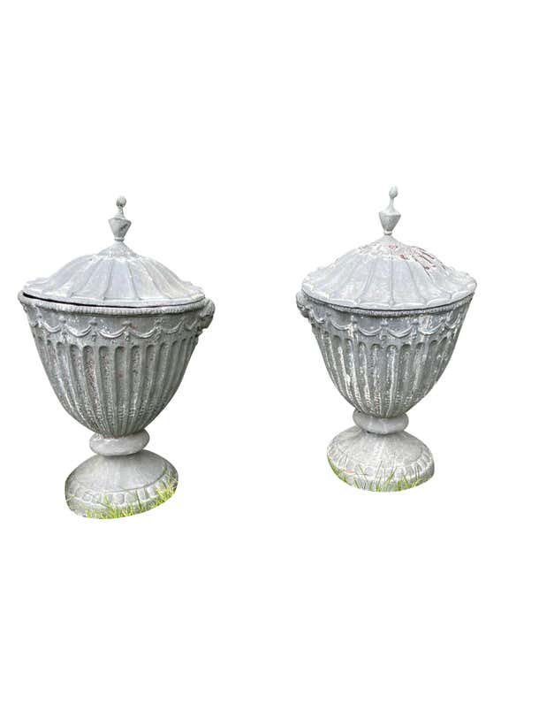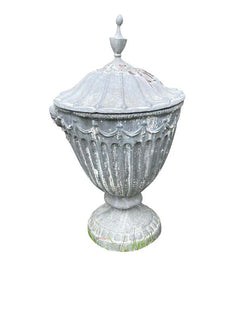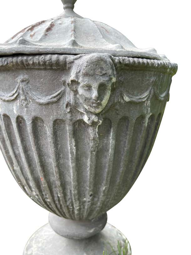 A pair of large antique 19th century English Regency period lead garden urns & covers. Each with fluted vase form body, urn top finial, mask handles, and classical garland decoration. Wonderful patina. Heavyweight. Good condition.