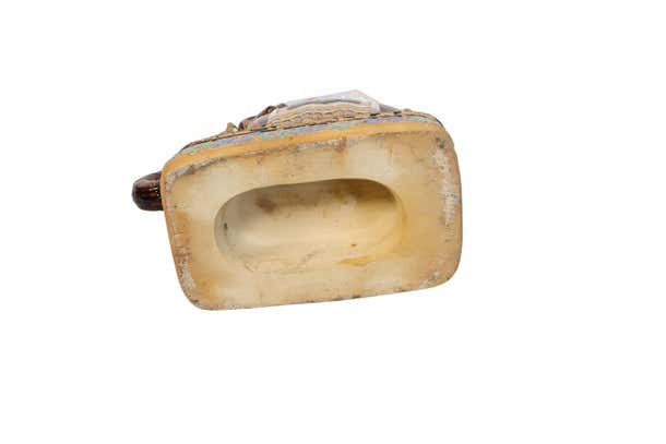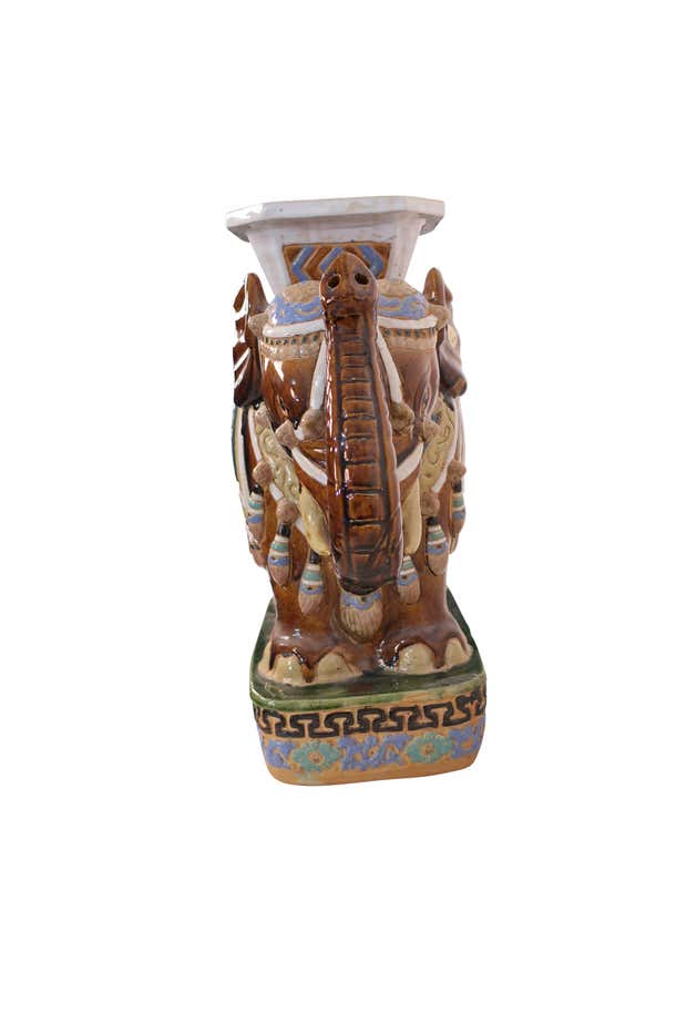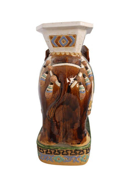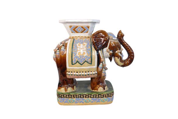 Single ceramic brown Asian elephant garden stool with brown yellow and white color and gold, green, and light lilac saddles and trim. The stool portrays an elephant with raised trunk. This adorable stool is perfect to set your drink down on as a side or end table or charming in any outdoor garden setting. Like new condition. It measures 23.5” H x 24” W x 12” D.
