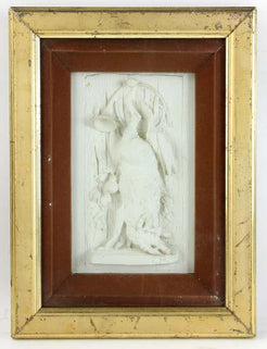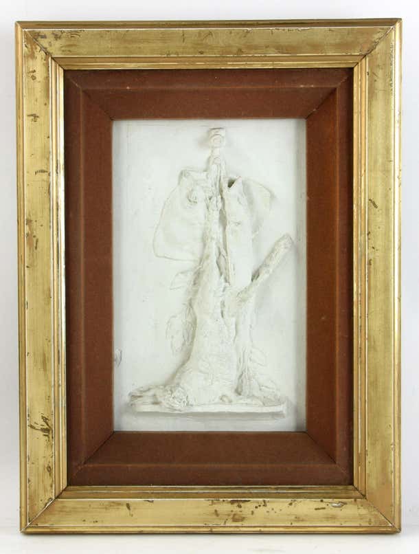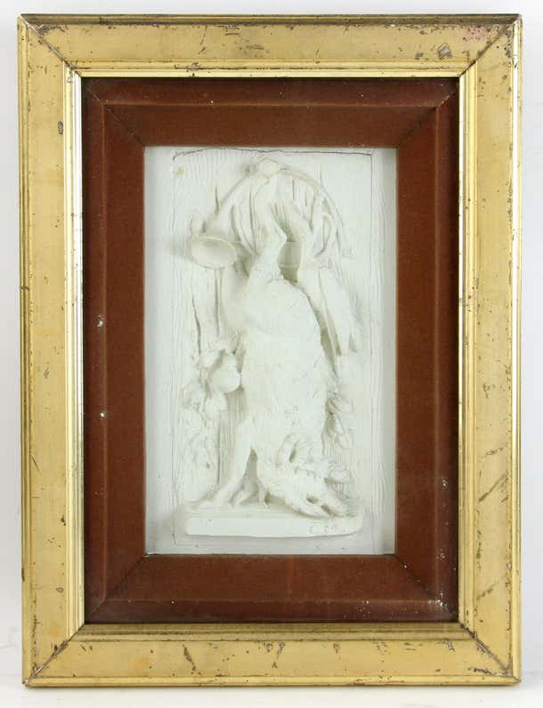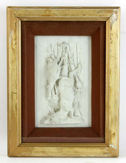 Animal Hunting motif-set of three gilt-framed plaster reliefs depicting wild boar, deer, and hare still life’s in white paster relief in burnt sienna velvet shadow boxes with original glass and gilt frames. All are signed CM by the artist.