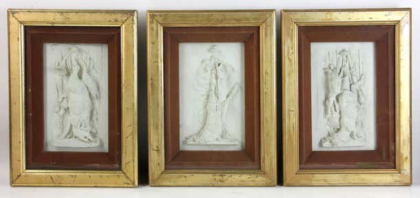 Animal Hunting motif-set of three gilt-framed plaster reliefs depicting wild boar, deer, and hare still life’s in whi...