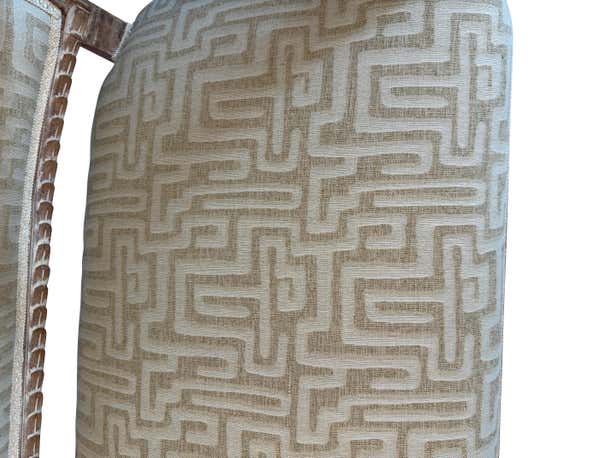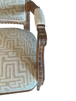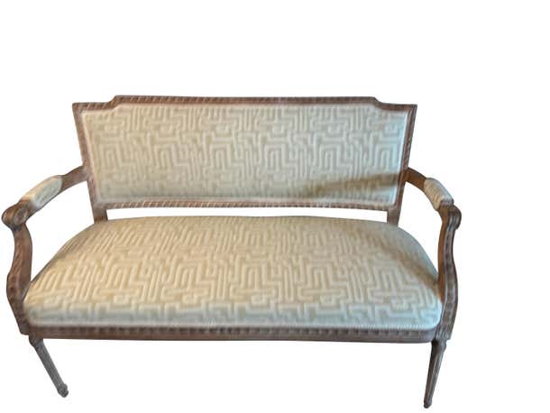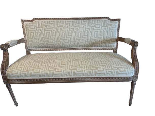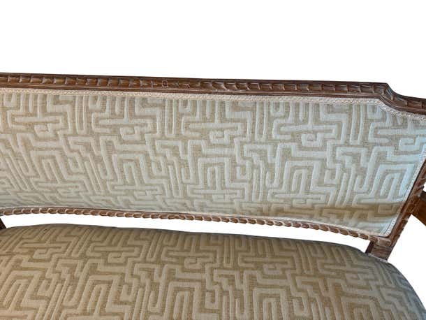 Beautifully carved 19th century natural beechwood settee with reticulated carvings along the frame padded arms newly re-upholstered in a modern geometric beige and white linen blend fabric. Attractive carvings along the arms and front legs ending in reeded legs with toupee feet. This would be a lovely addition to any foyer, hallway, bedroom or living room.