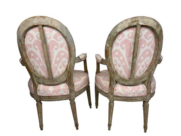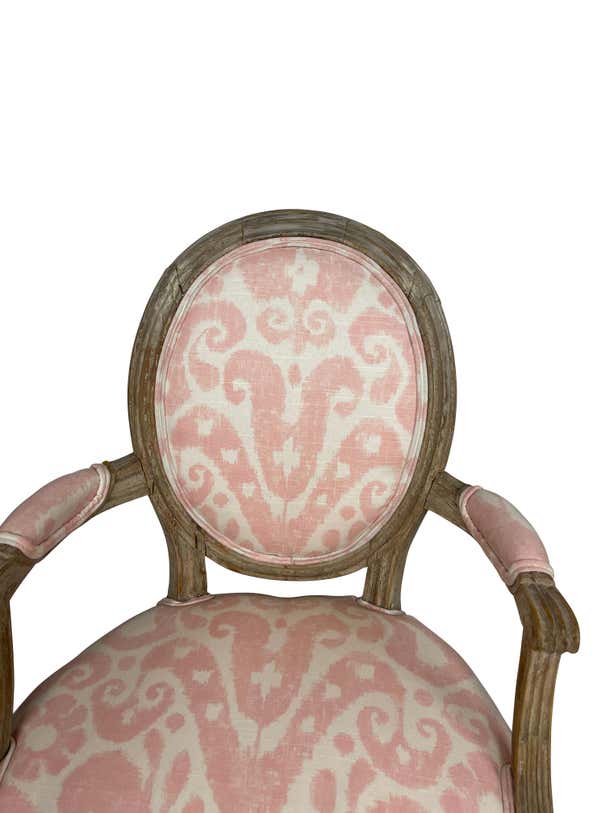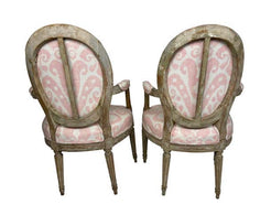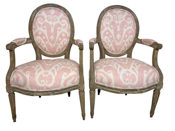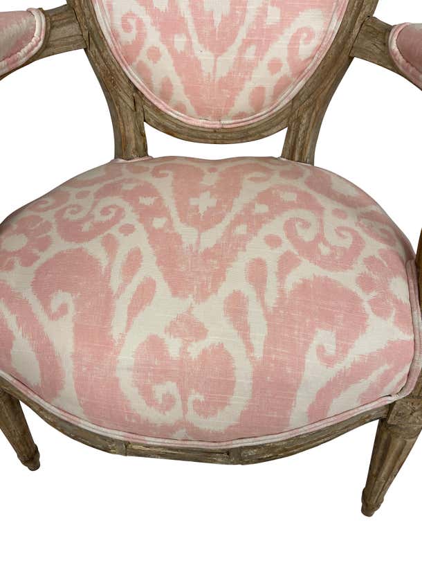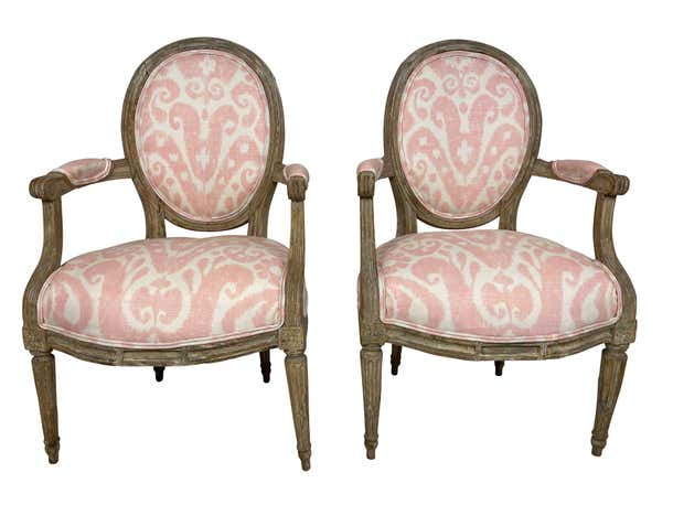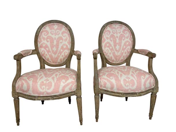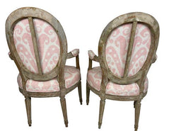 Pair of Grey painted and carved Louis XVI style small armchairs. Perfect for a little girls' room or bedroom. Newly professionally upholstered in pink Ikat fabric.
