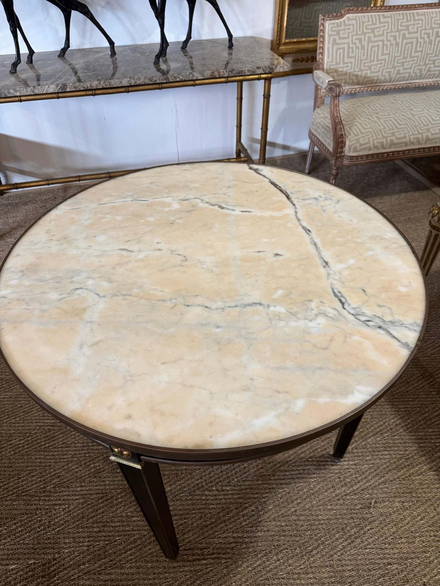 French Neoclassical-style circular black painted table with beige veined marble top, having brass cross banded trim and detailed brass rosette decoration within each cross band and larger rosette decoration on each leg. Straight Neoclassical legs ending in brass caps on each leg. Labeled Trouvailles Home Inc., a very high end importer of Continental antiques. The table is attractive and functional as a center table for flowers and photos or as an elegant end or side table in a living room or bedroom. Measures 30 H X 35 D. A perfect size.