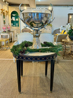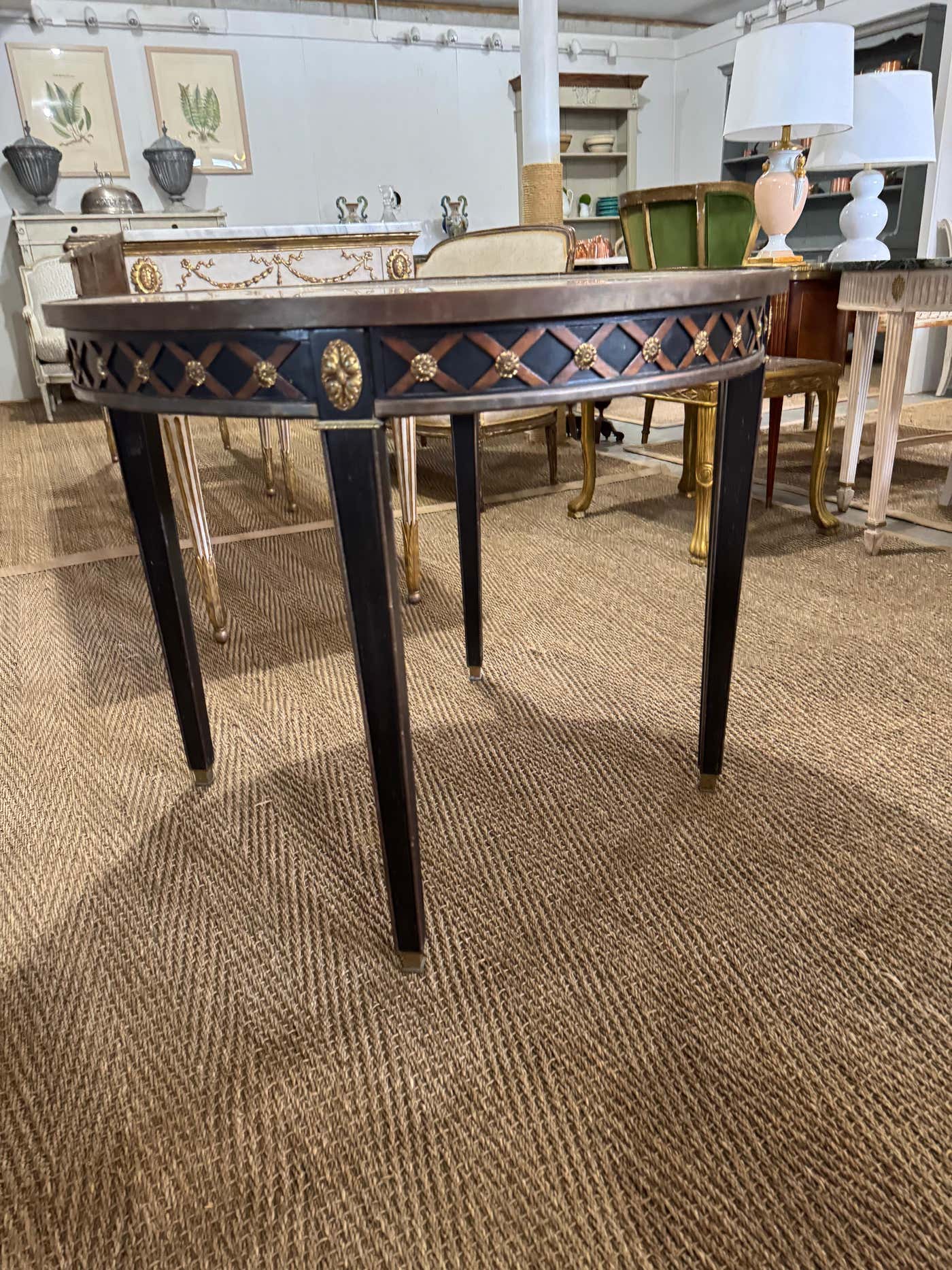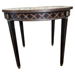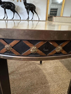French Neoclassical-style circular black painted table with beige veined marble top, having brass cross banded trim a...