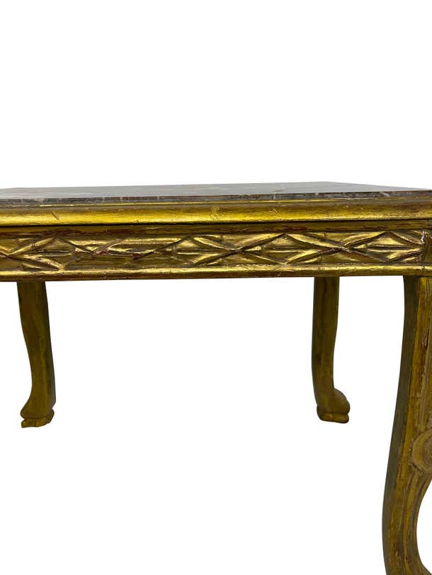 Highly decorative small Louis XV style gilt side table with grey marble top, carved legs ending in paw feet with extensive carving throughout. Measures: 20 1/2" H x 24" W x 18 1/2" D.