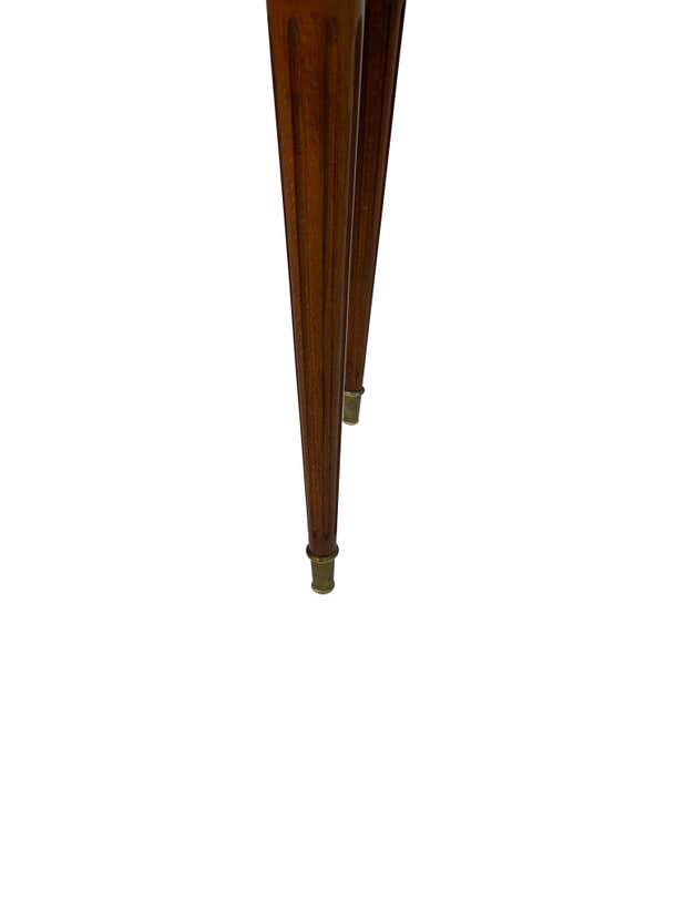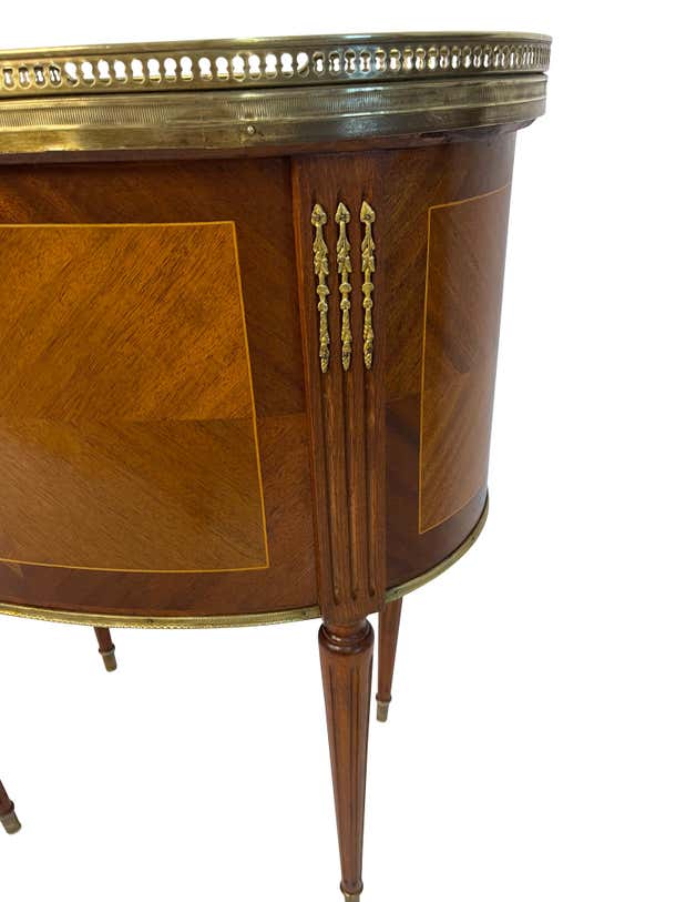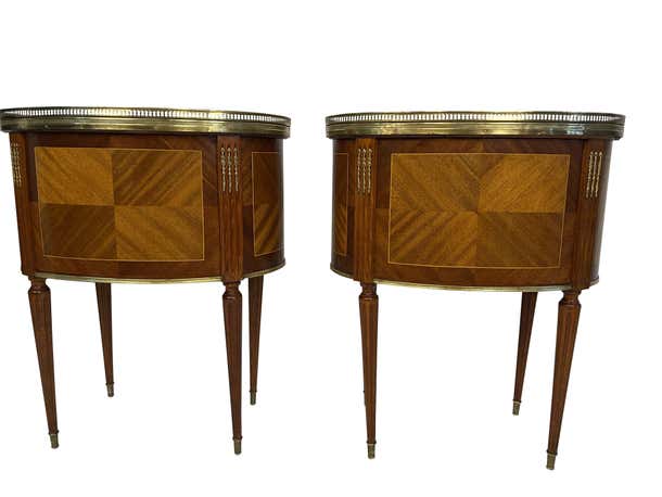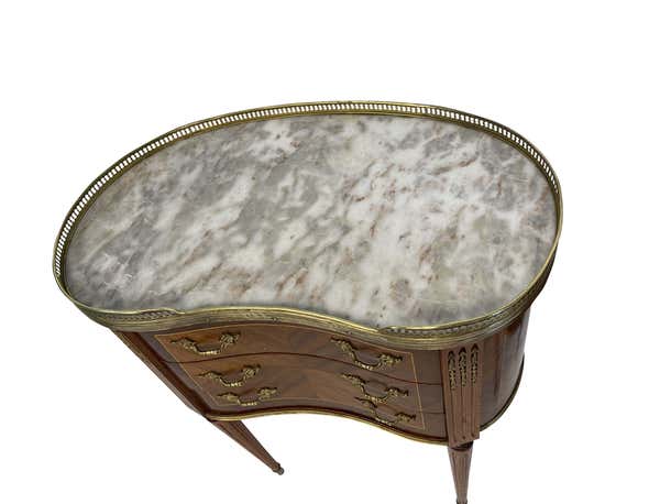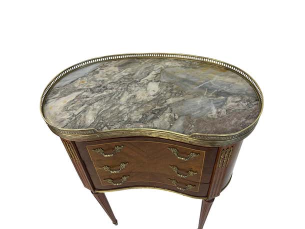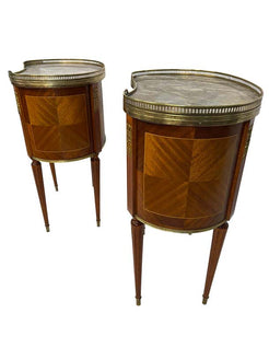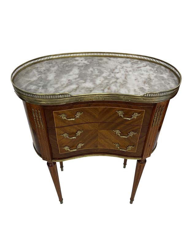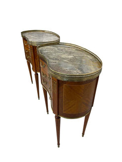 An elegant pair of matching Louis XVI style kidney-shaped bouillote tables with marble tops surrounded by pierced brass galleries. The marble is a beautiful grayish-white. Each table has three drawers. The reeded legs rest on brass casters. The perfect size and height for a distinctive side table. Beautiful marquetry woodwork through the front and back and the lovely reeded legs continue to the top of the tables with additional brass decorative elements. These lovely and versatile tables can serve as side tables or nightstands.
