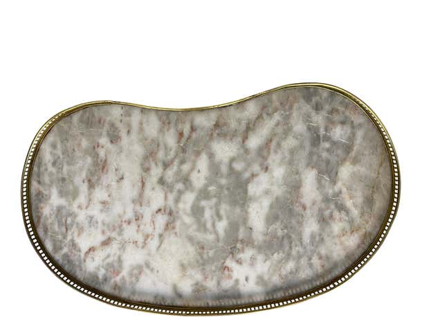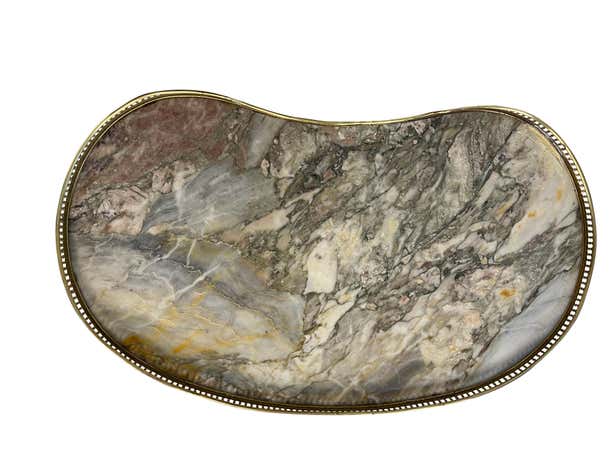 An elegant pair of matching Louis XVI style kidney-shaped bouillote tables with marble tops surrounded by pierced bra...