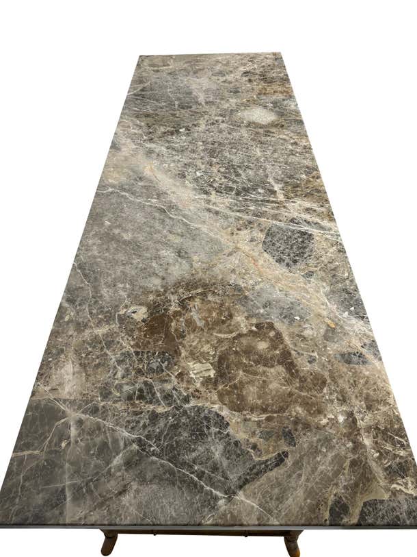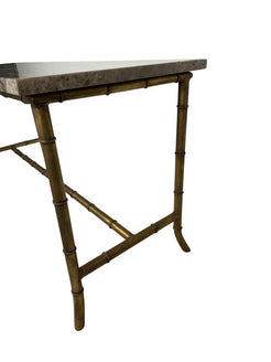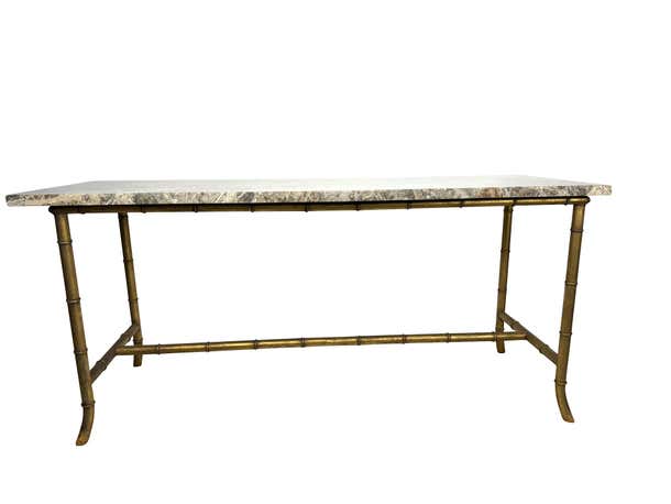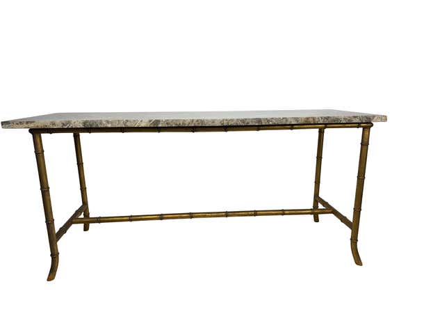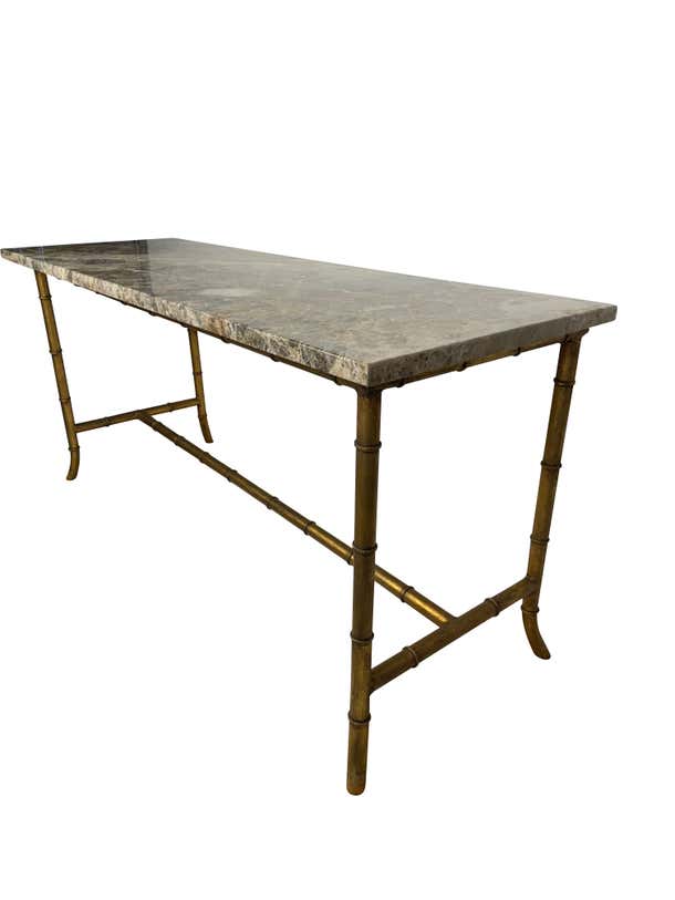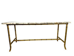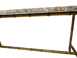 1940's Maison Jansen style brass Bamboo console table with exceptionally fine casting and patina throughout with professionally polished heavy brown marble top, The table measures 64.5 L X 22.5 W X 30 H . It would be lovely in a foyer, living room or any room in the house.
