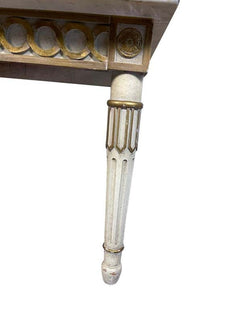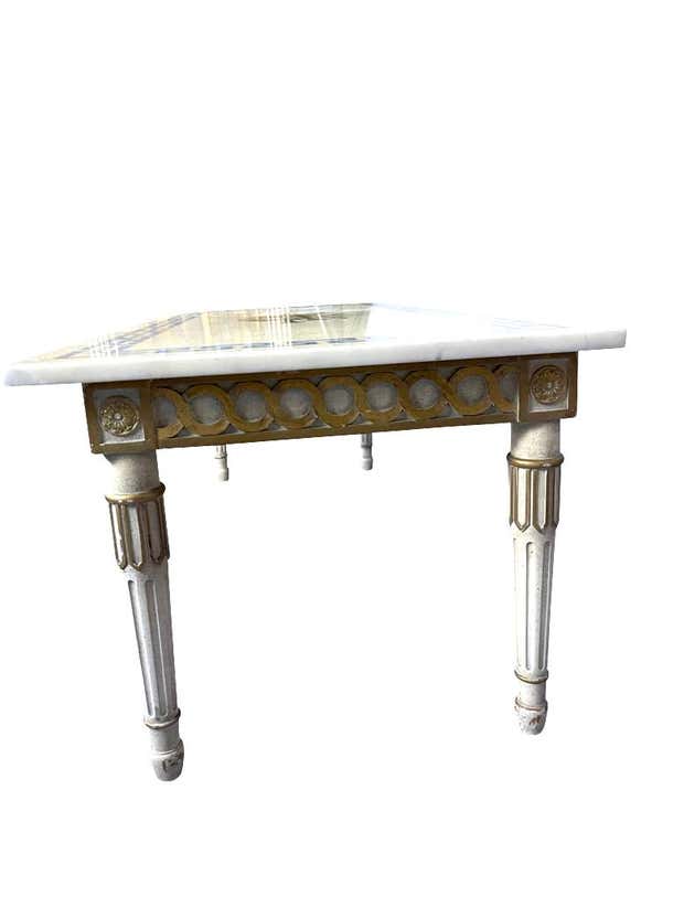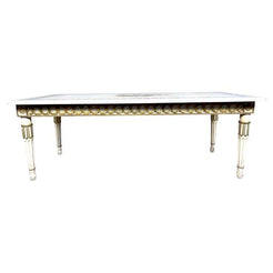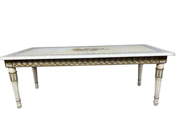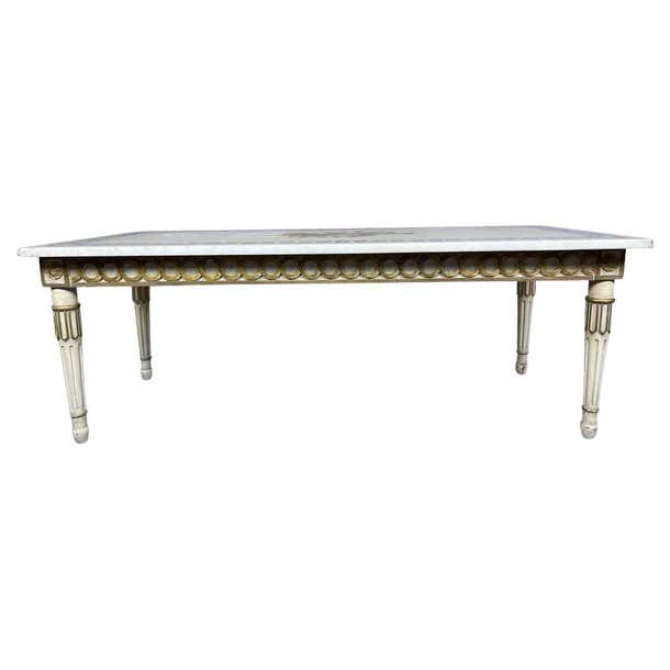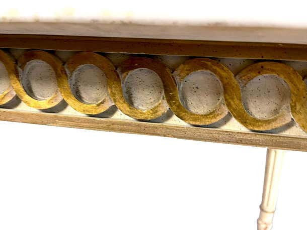 Marble top white and gilt coffee table with Greek key and decorative inlay Pretty 1940s Italian marble top with blue ...