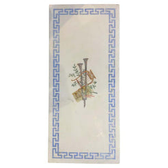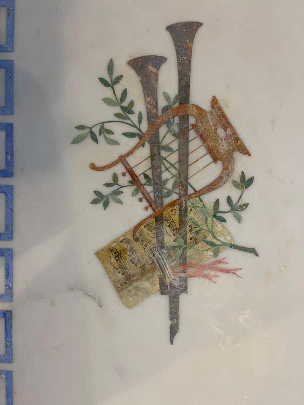 Marble top white and gilt coffee table with Greek key and decorative inlay Pretty 1940s Italian marble top with blue Greek key design and musical instruments inlay.