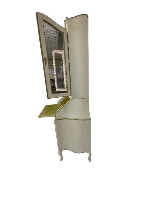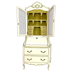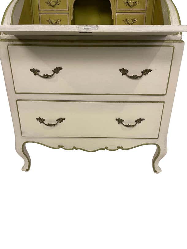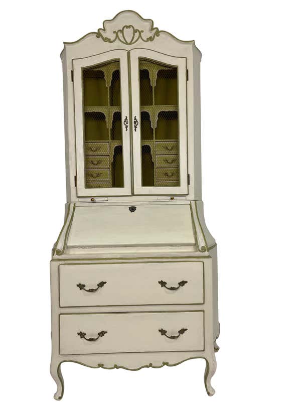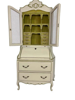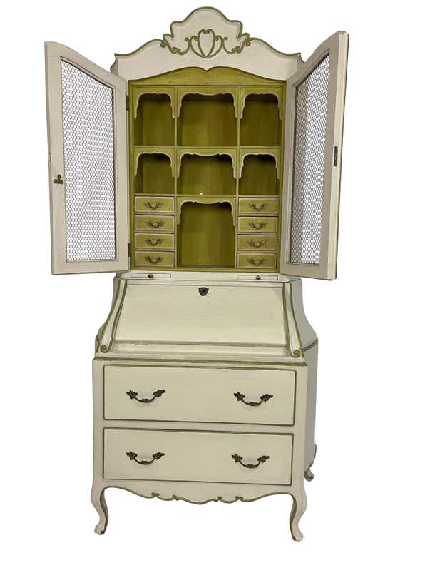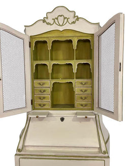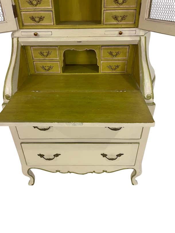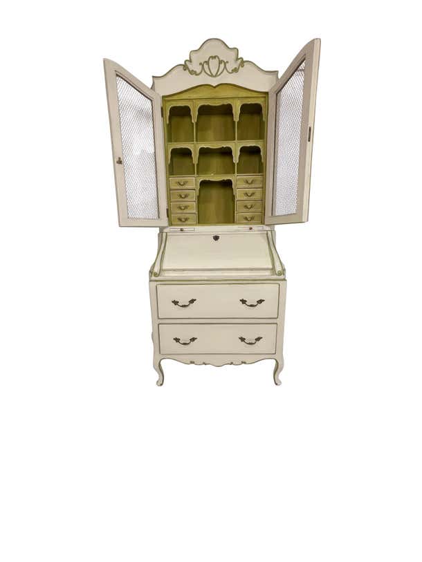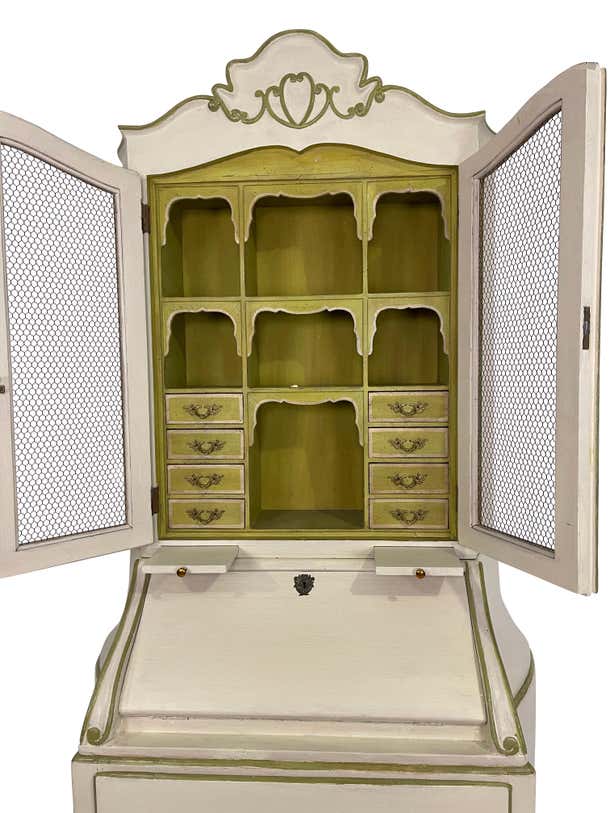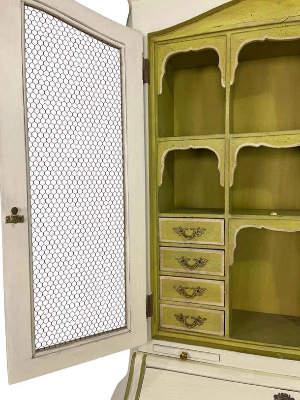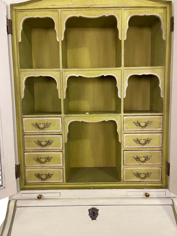 In an all-over ivory paint with a wonderful light green interior throughout this beautiful turn of the century, a French provincial secretary/desk came out of a New York City Park Avenue apartment. This lovely drop-front desk reveals four small drawers and cubby holes in the era's style. True to its french provincial origins, the top is fitted with chicken-wired doors, revealing a bevy of small drawers and cubby holes within. The cornice is decorated with swirled paint in the same green. This stylish piece has its original key and would be the central focus of any bedroom or stylish living room. Measures 87 H X 34 W X 20.5 D. Desk is 30.5 in-depth open.