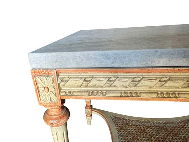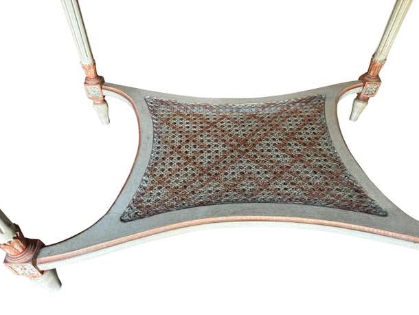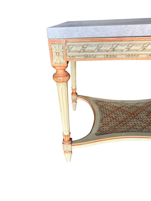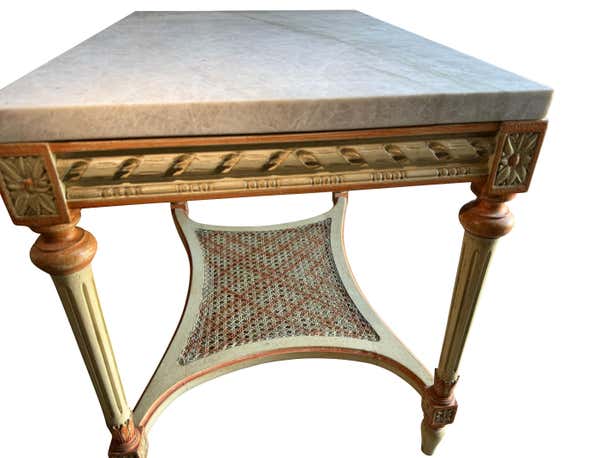 A pair of Louis XVI style Paint decorated end tables in cream paint with peach accents. The tables have newly polished Taj Mahal marble tops. Lovely reeded legs with the classic Louis XVI rosettes, gilt accents, and an apron carved with a ribbon motif. The base of the tables are finished in natural cane with a painted lattice motif giving the tables a more airy look. They are very sturdy, and decorative and a good height for lamps. 24 H X 20W X 30L