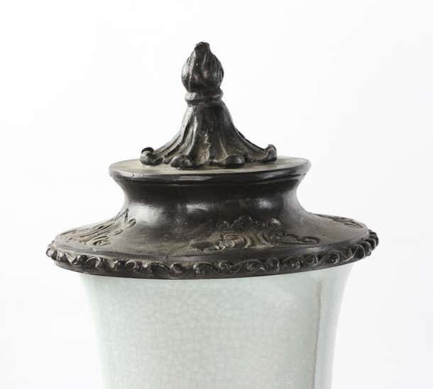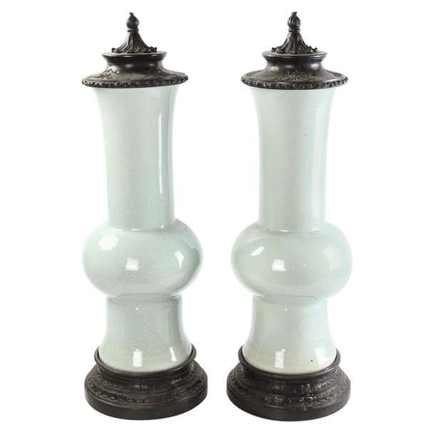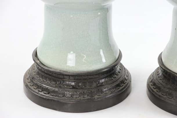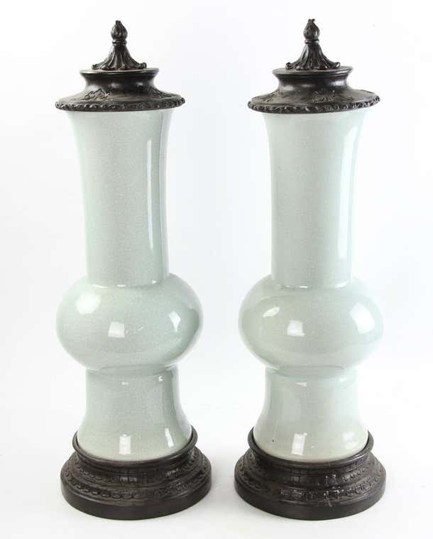 Pair of Chinese Celadon Gu Shaped Porcelain Vases with Metal Covers and Base