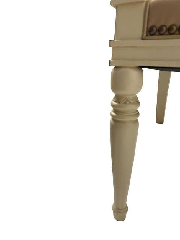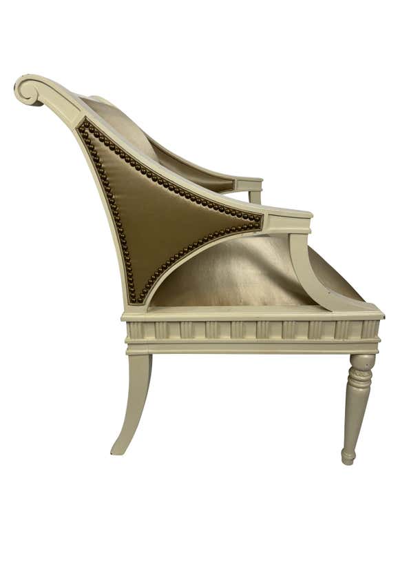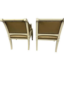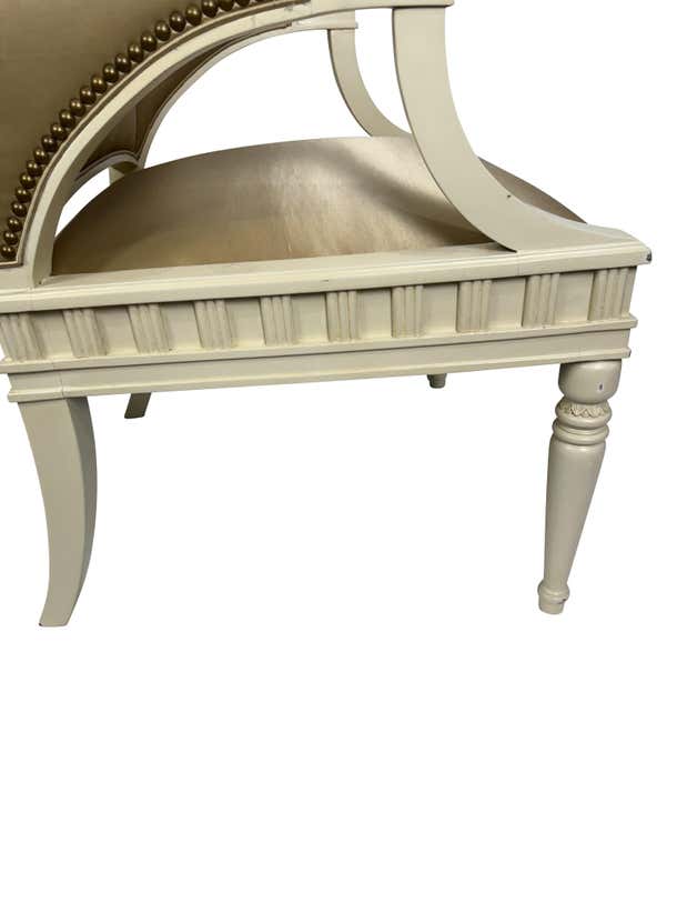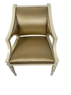 Pair of Custom decorator Armchairs in champagne silk upholstery with brass nailheads. Large ample size comfortable seating. Painted in Creme wood with turned front legs and Klimos style back legs, Lovely carving on the side aprons. A wonderful pair covered in a neutral fabric, Ready to elevate your decor as is, or a nice pair to recover. 34 H X 28.75 W X 21 D Seat Ht 17"