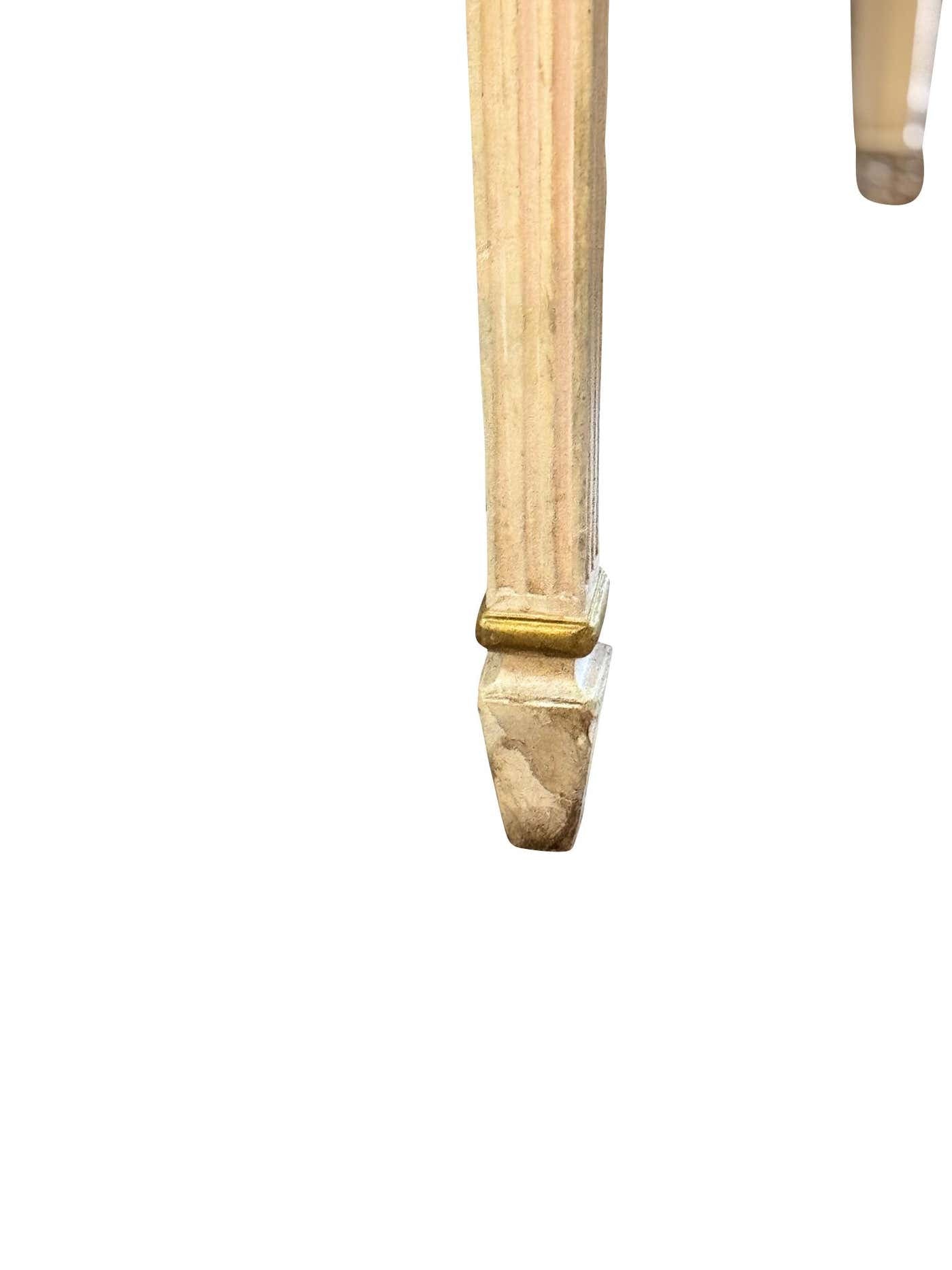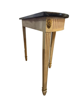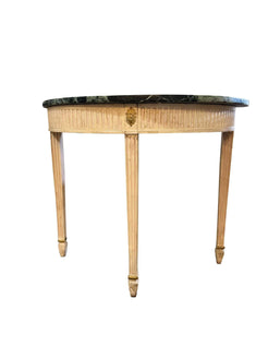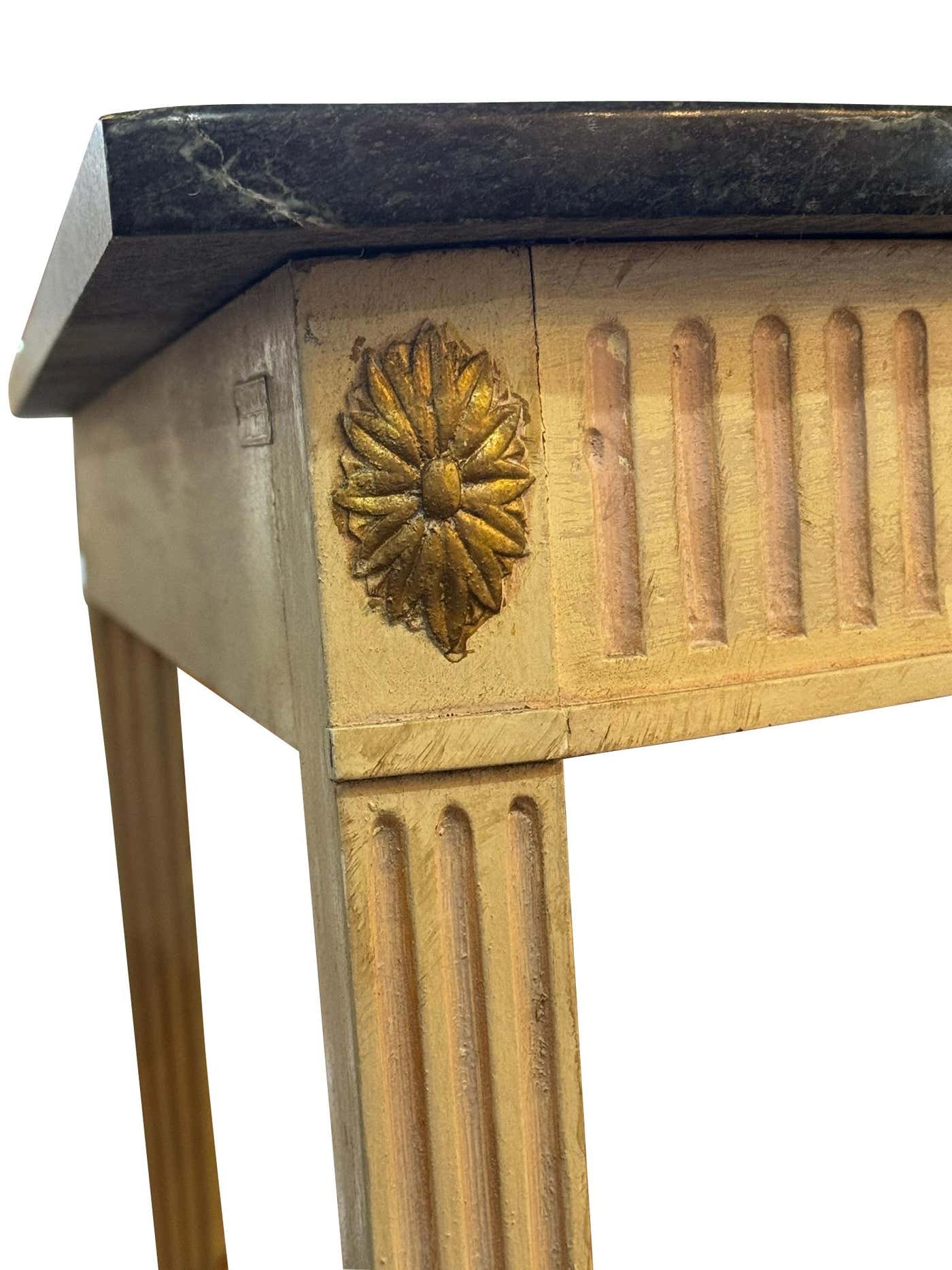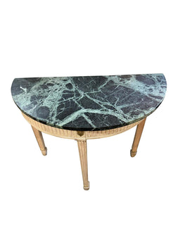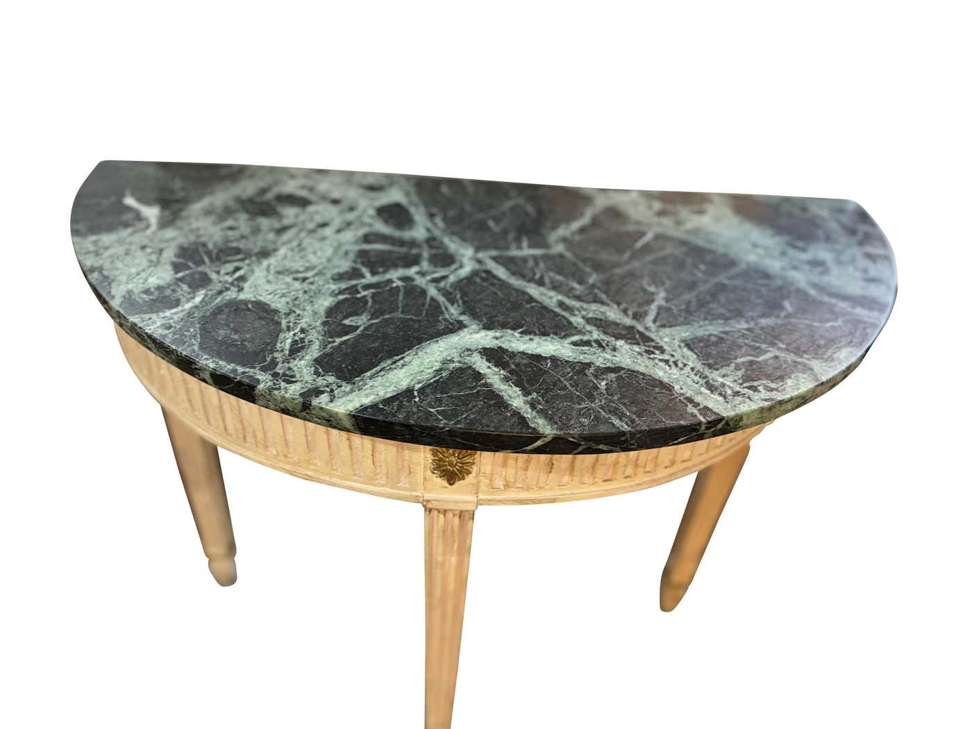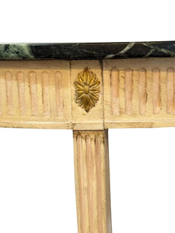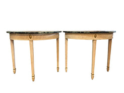 Pair of Waldorf Astoria demilune painted neoclassical carved console tables with green-veined marble tops, reeded leg...