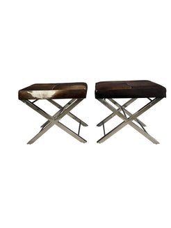 Pair of mid-century cowhide-covered benches with chrome cross bases. Natural cowhide in brown and white with tan coloration. Lovely shiny chrome cross-legged base.