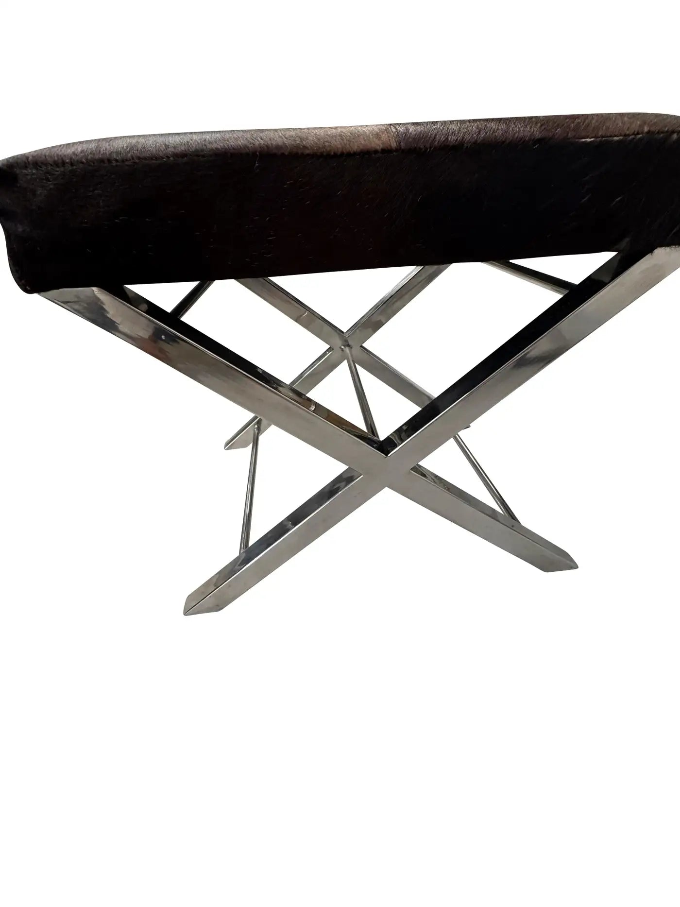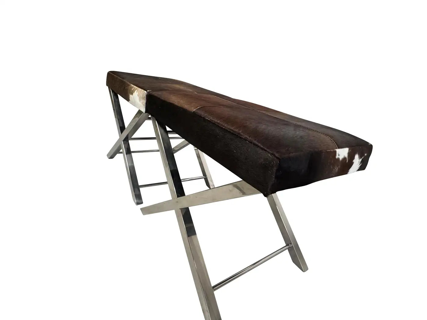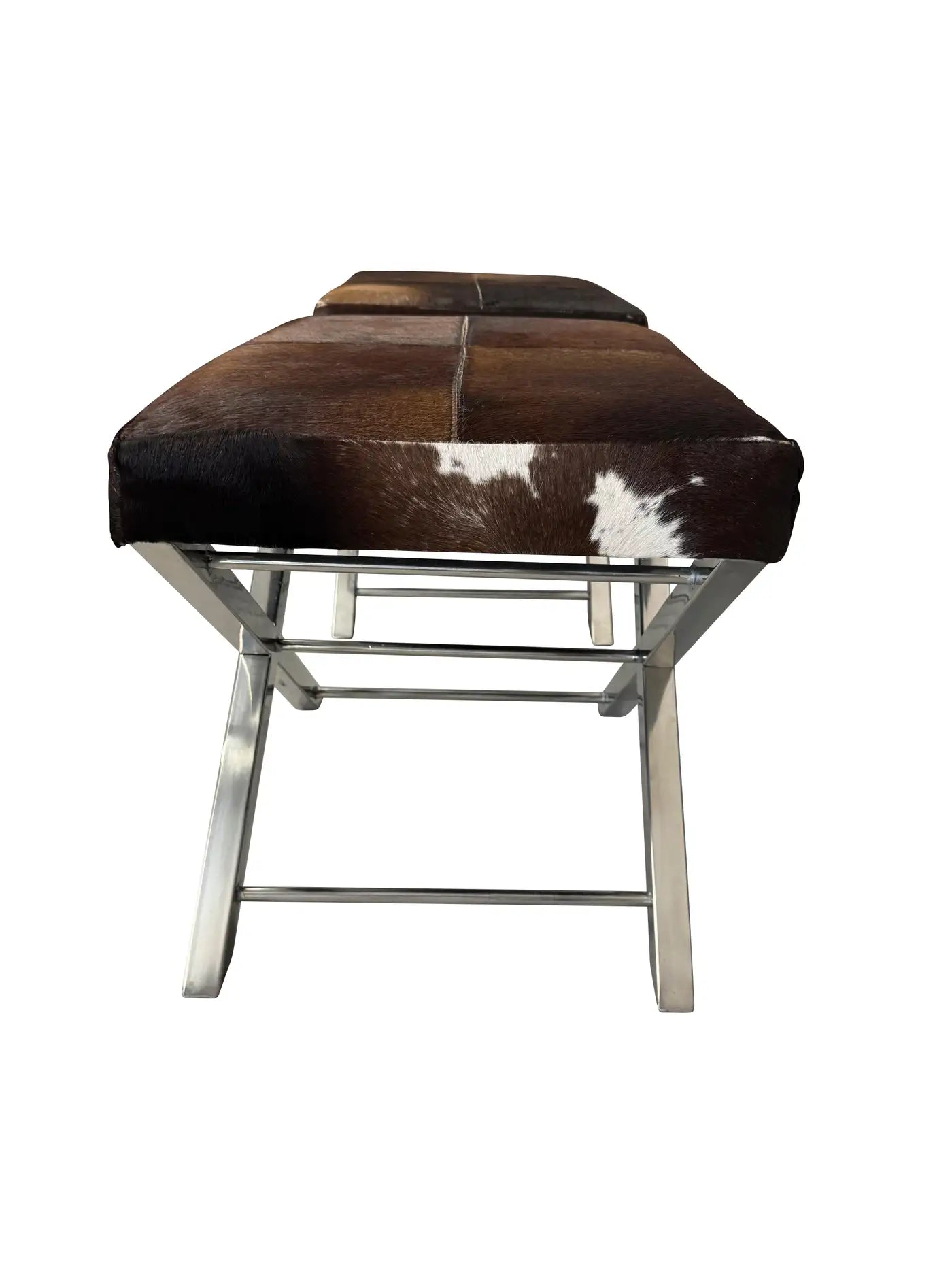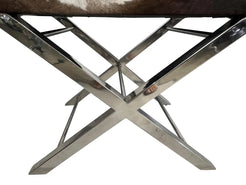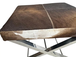 Pair of mid-century cowhide-covered benches with chrome cross bases. Natural cowhide in brown and white with tan colo...