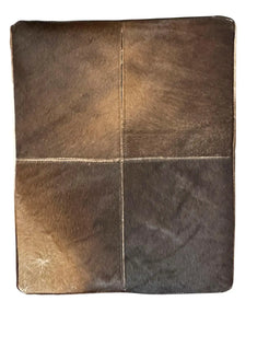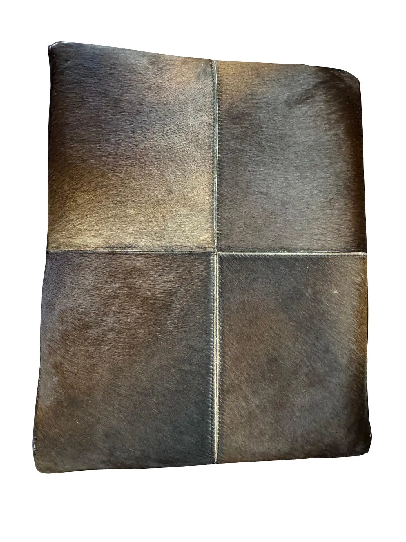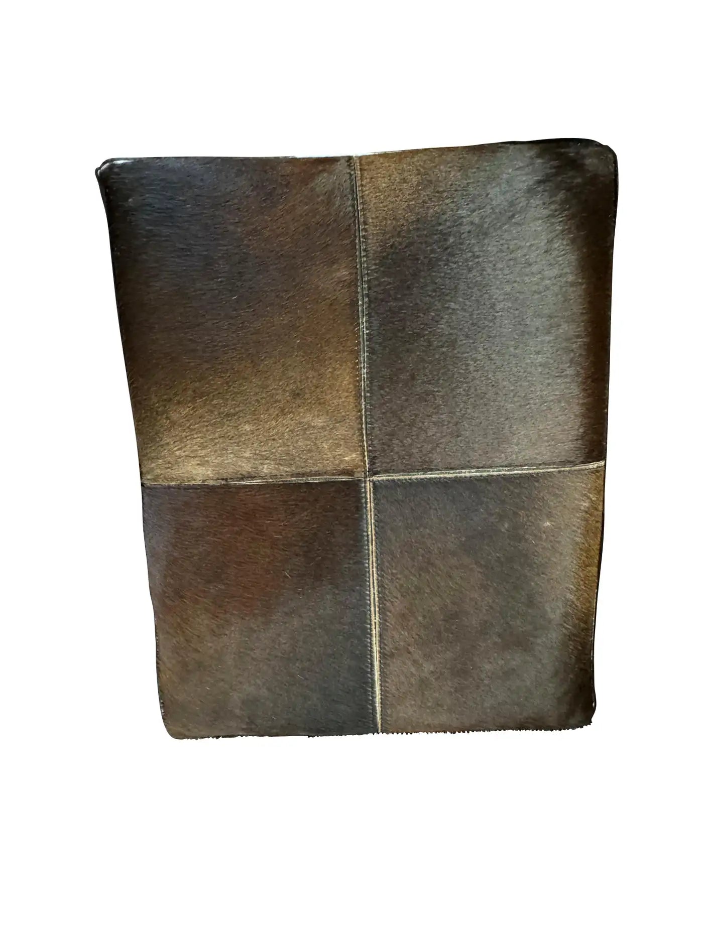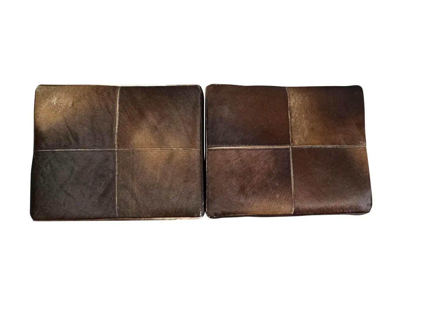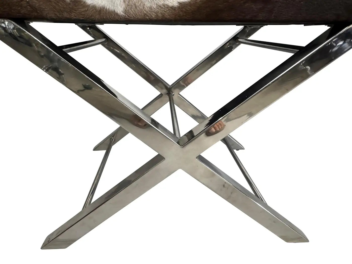 Pair of mid-century cowhide-covered benches with chrome cross bases. Natural cowhide in brown and white with tan colo...