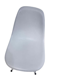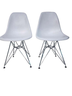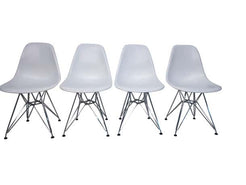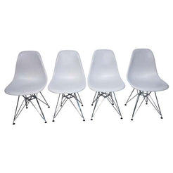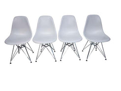 Eames for Knoll molded white plastic chairs with iconic stainless steel Eiffel Tour bases. Marked Eames for Knoll A more compact yet exceedingly versatile seating option, the Eames® Molded Plastic Side Chair Wire Base from Herman Miller® is crafted in the same proprietary production process for which the original Eames® Molded Plastic chair has become known worldwide. This chair sits atop a 4-leg stainless steel base for supreme stability and support. Ideal for office spaces, dining rooms, and casual entryway seating areas, this chair's subtle curves and wire base offer visual lightness and eye-catching style that keeps furniture collectors coming back time and time again. Dealer-arranged shipping is available.