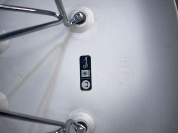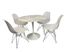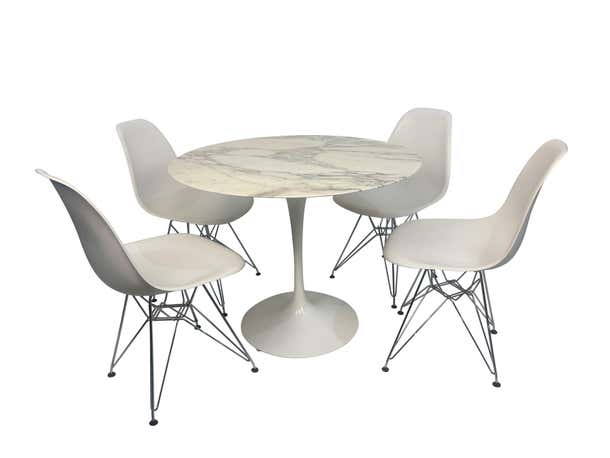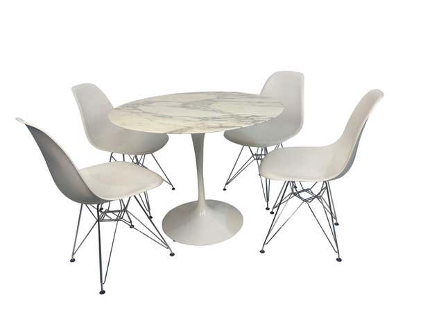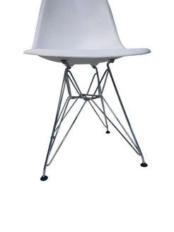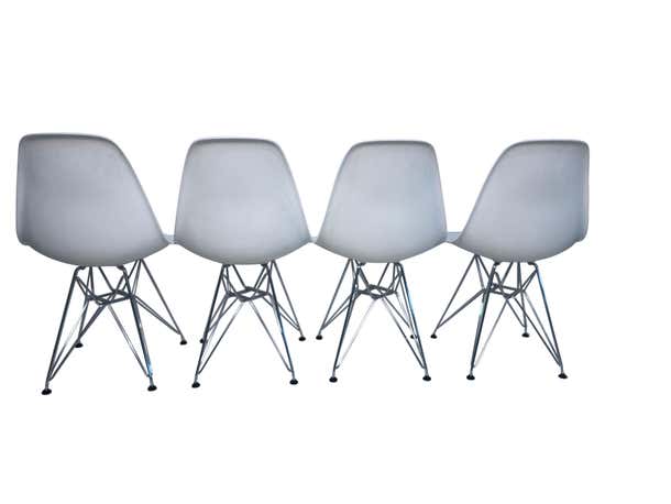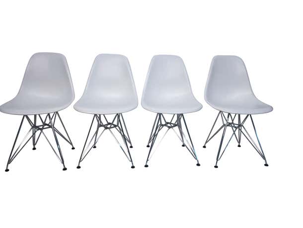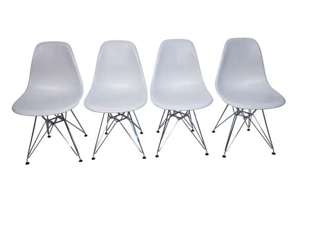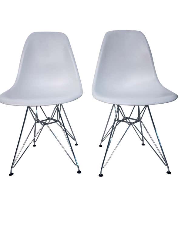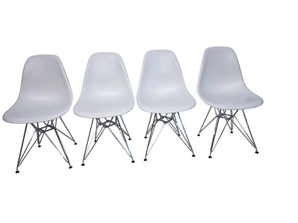 Eames for Knoll molded white plastic chairs with iconic stainless steel Eiffel Tour bases. Marked Eames for Knoll A m...