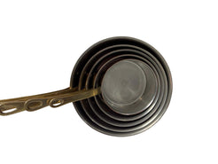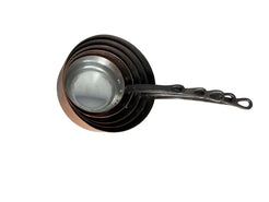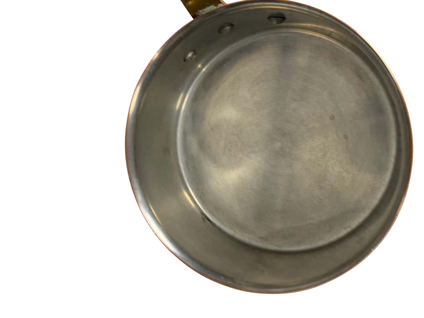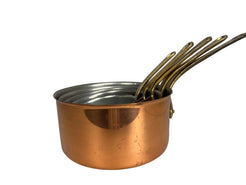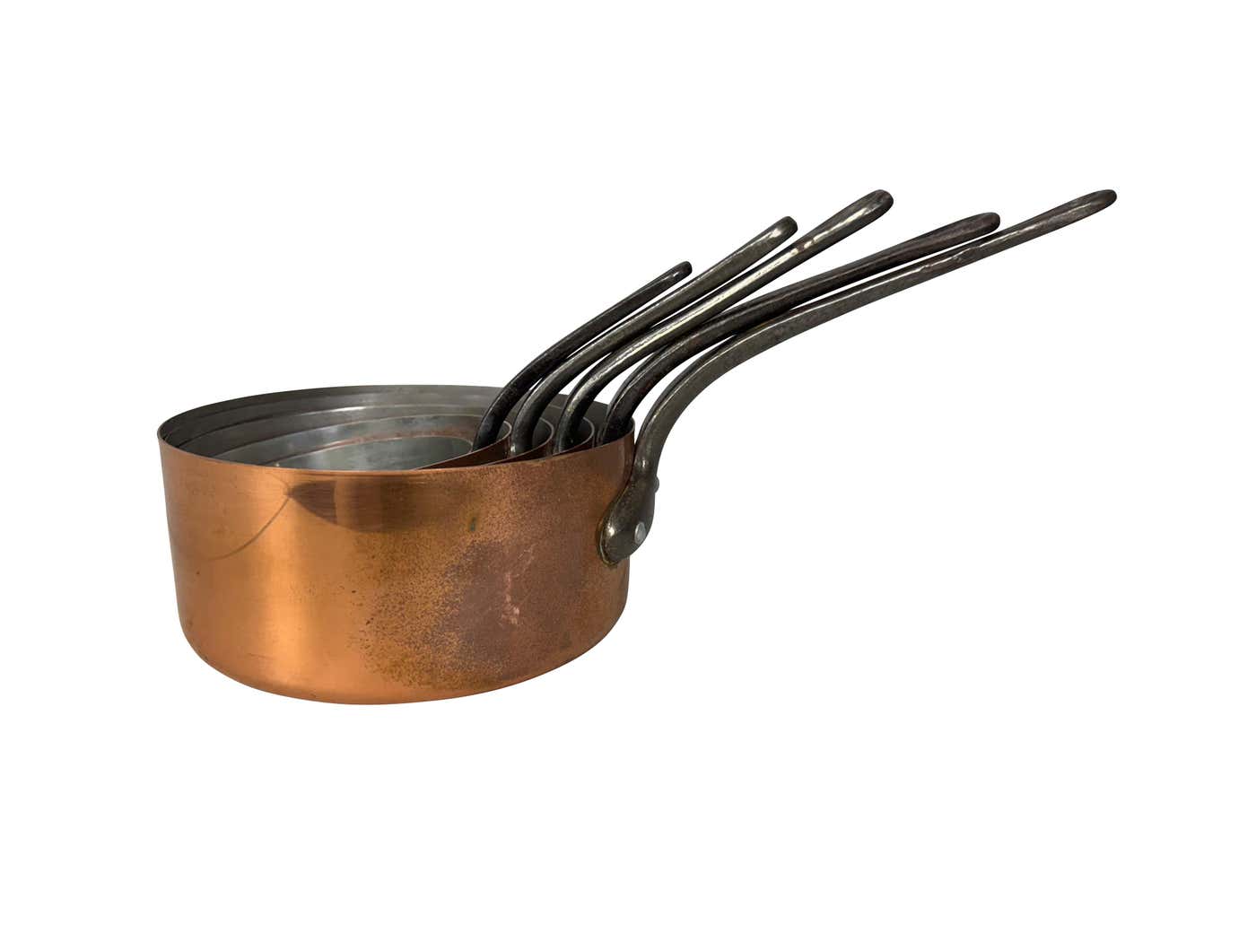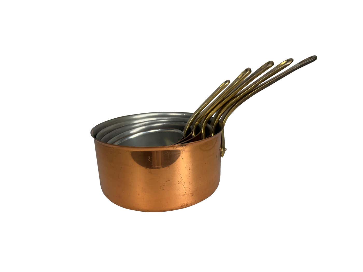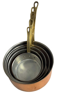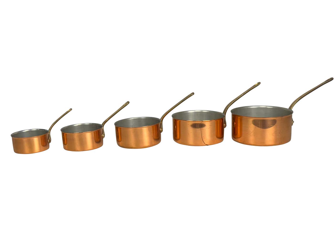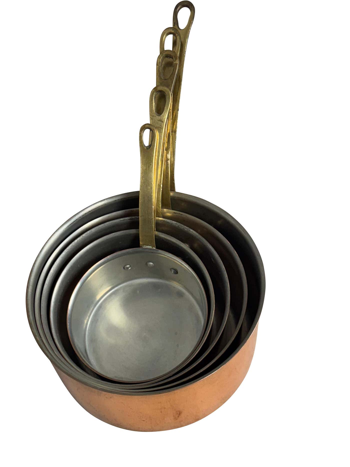 A set of 5 graduated copper pans with brass handles. A beautiful set of 5 vintage copper saucepans, a must for your French-inspired kitchen. Made in the second half of the 20th century, this set of 5 saucepans is in excellent vintage condition and is superb in its quality. Each saucepan has been stamped with "Made in France" – denoting the origin of the saucepans as one of high-quality French copper cookware. The pots have quality brass handles, and copper bubble rivets and are lined with tin. The tin interiors are in near-perfect vintage condition, they can be used for cooking immediately. The copper exteriors of the pots have a beautiful patina and have been professionally polished. Dimensions: The diameter of each pot from largest to smallest is 5 inches in diameter, 6 inches, 7 inches, and 7.5 inches and the largest is 8 inches in diameter.