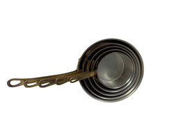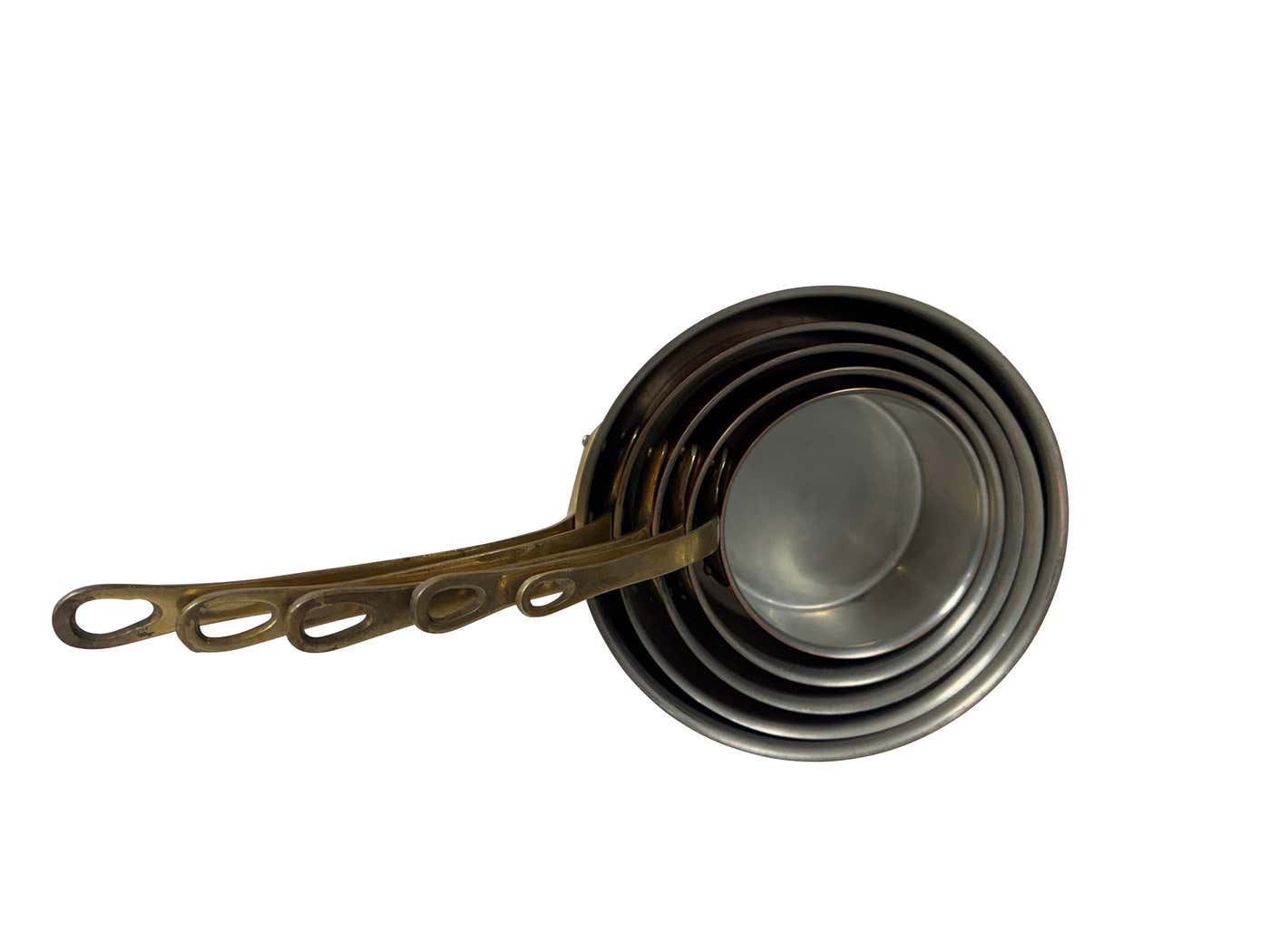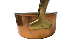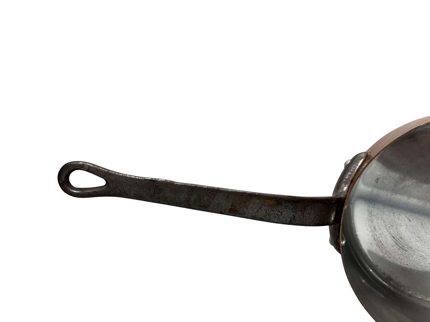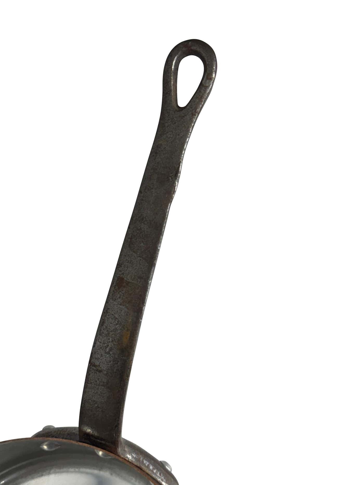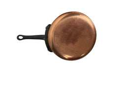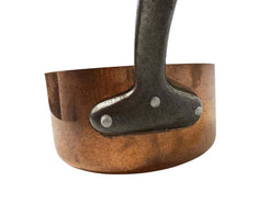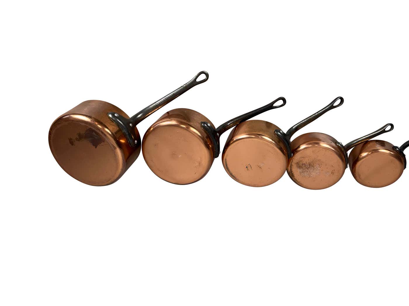 A set of 5 graduated copper saucepans with iron handles. A beautiful set of 5 vintage copper saucepans, a must for your French-inspired kitchen. Made in the first half of the 20th century, this set of 5 saucepans is in excellent vintage condition and is superb in its quality. Each saucepan is an example of high-quality French copper cookware. The pots have quality hand-forged iron handles, and bubble rivets and are lined with tin. The tin interiors are in near-perfect vintage condition, they can be used for cooking immediately. The copper exteriors of the pots have a beautiful patina and have been professionally polished. Dimensions: The diameter of each pot from largest to smallest is 4.5 inches in diameter, 5.5 inches, 6.25 inches, and 7 inches and the largest is 7.5 inches in diameter. A quality set.