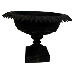 Victorian black cast iron round urn form jardinière/ planter. Pedestal base with leaf form decoration and flower petal decoration around the rim, a hole in the bottom for drainage. The basin sits on a square base. Black matte finish beautiful indoor or outdoors.