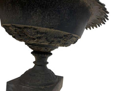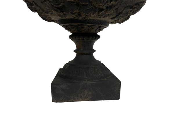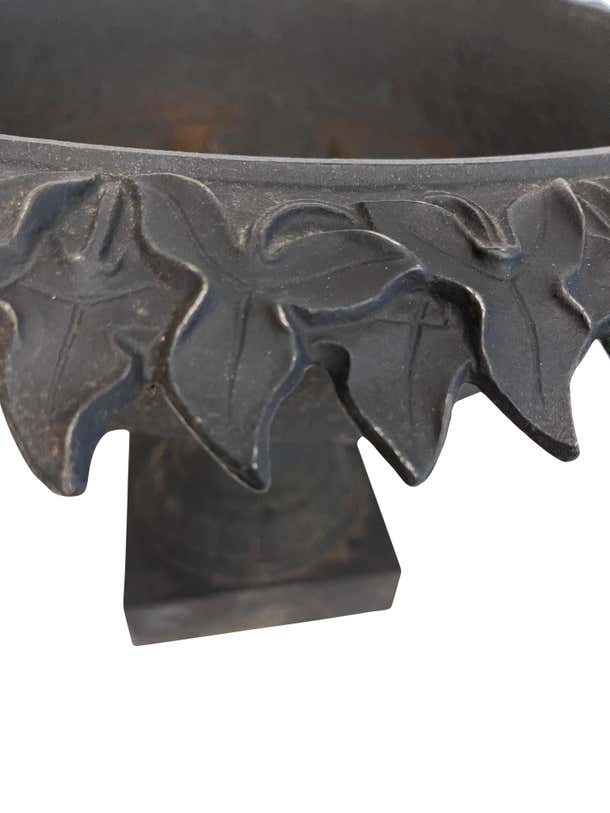 Victorian black cast iron round urn form jardinière/ planter. Pedestal base with leaf form decoration and flower peta...