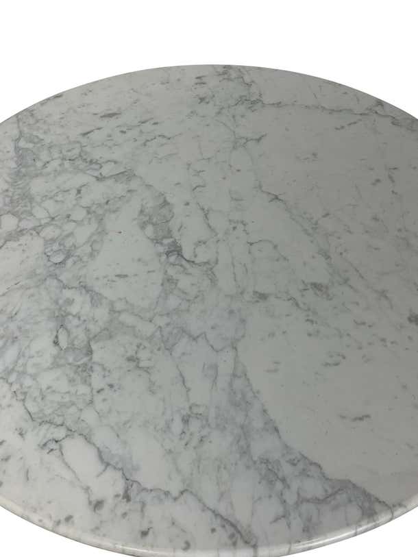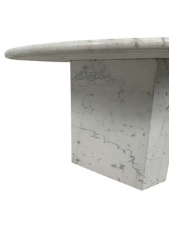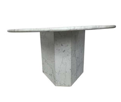 Very special solid white Carrara marble round dining, foyer, or kitchen table with a 3-sided polygon base. This table...