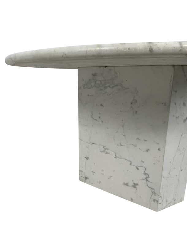 Very special solid white Carrara marble round dining, foyer, or kitchen table with a 3-sided polygon base. This table was handcrafted from Carrara marble in Italy. Solid top and base and a sealed marble surface for dining and meals. This table would look spectacular in a foyer as a center table or can accommodate 4-6 comfortably for dining. A true statement piece in any room.